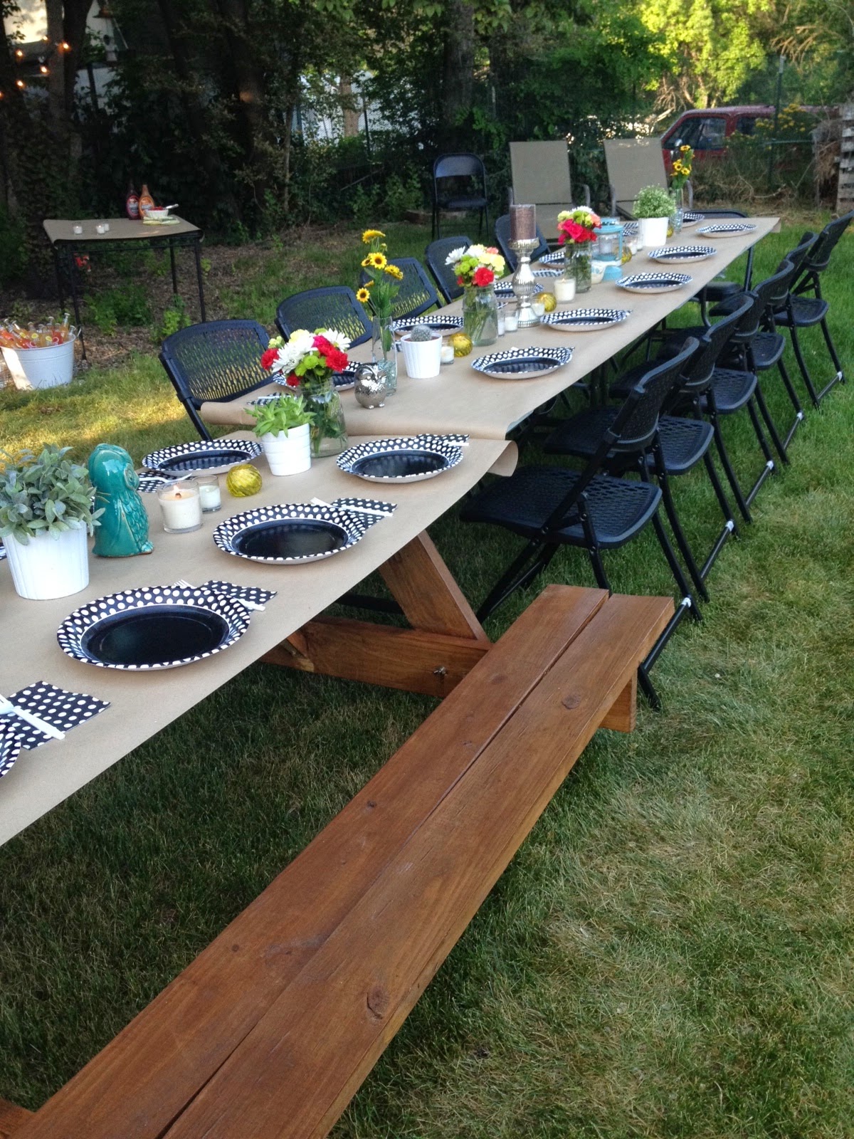 We gathered up some great things from my house decorations, my sister-in-laws, and some from Shelley's house! We got our flowers at Costco, stuck them in mason jars, had candles, (citronella ones of course!), and some cactus plants from Ikea that added a nice touch.